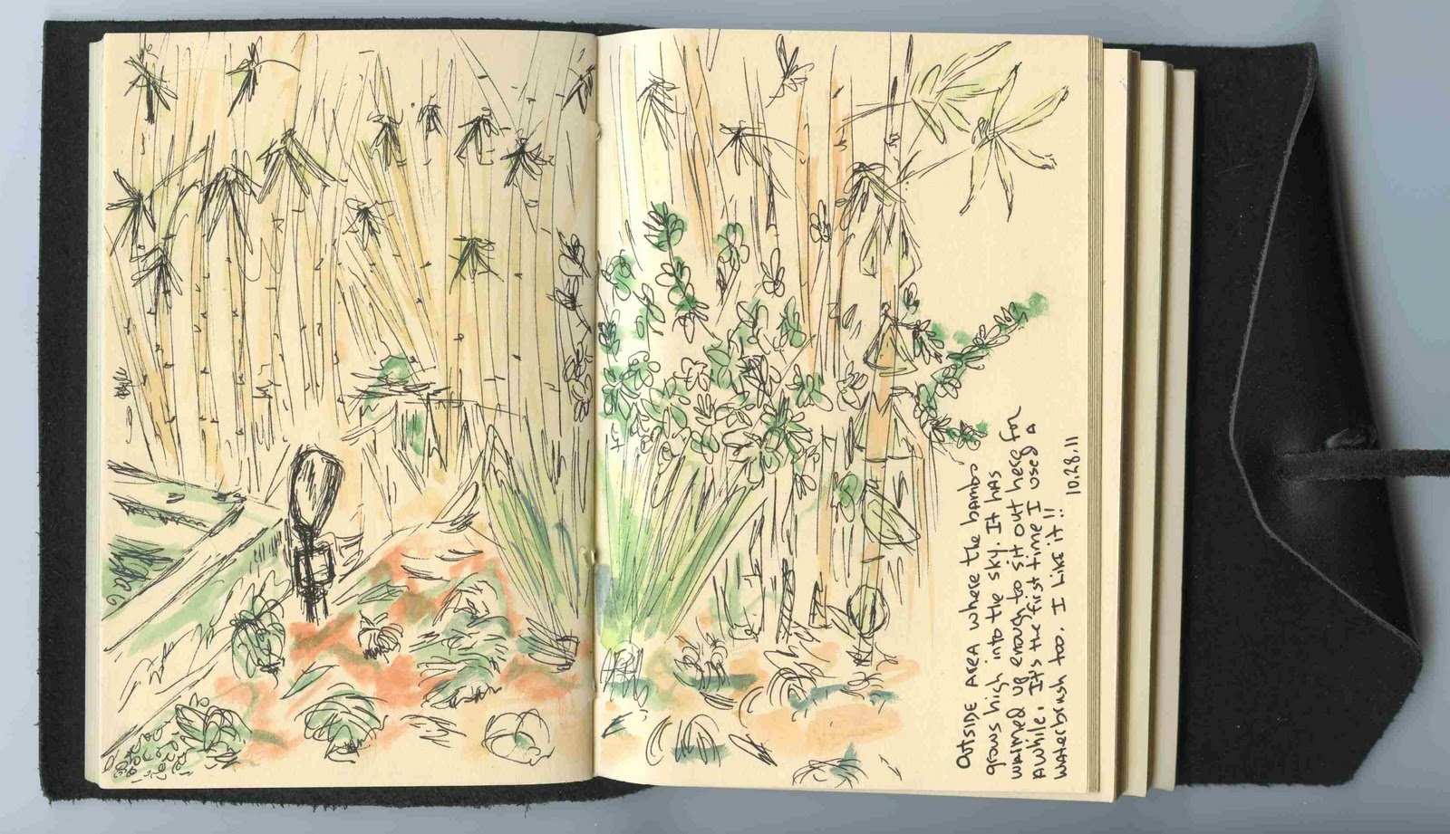 ....I'm beginning to enjoy the waiting around at Dr's offices or in this case surgery centers. I was there today for my partner who was getting some eye surgery done. I hung out in the reception area and then when the temp warmed up some, there was a nice little patio area to explore and sketch. There was a lot of bamboo to draw and I got to use my water brush for the first time. Surgery was successful and I got in some sketching time. win-win.